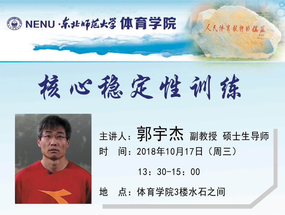 2018年10月17日(星期三)下午13:30在威尼斯8866993F水石之间将邀请威尼斯官网排球教研室主任郭宇杰副教授讲授《核心稳定性训练》学术讲座,郭老师将以赴广州体能培训的切身体会,介绍核心稳定性训练的新理念、新思路及新方法,请威尼斯官网35岁以下青年教师及感兴趣的老师积极参加、观摩。