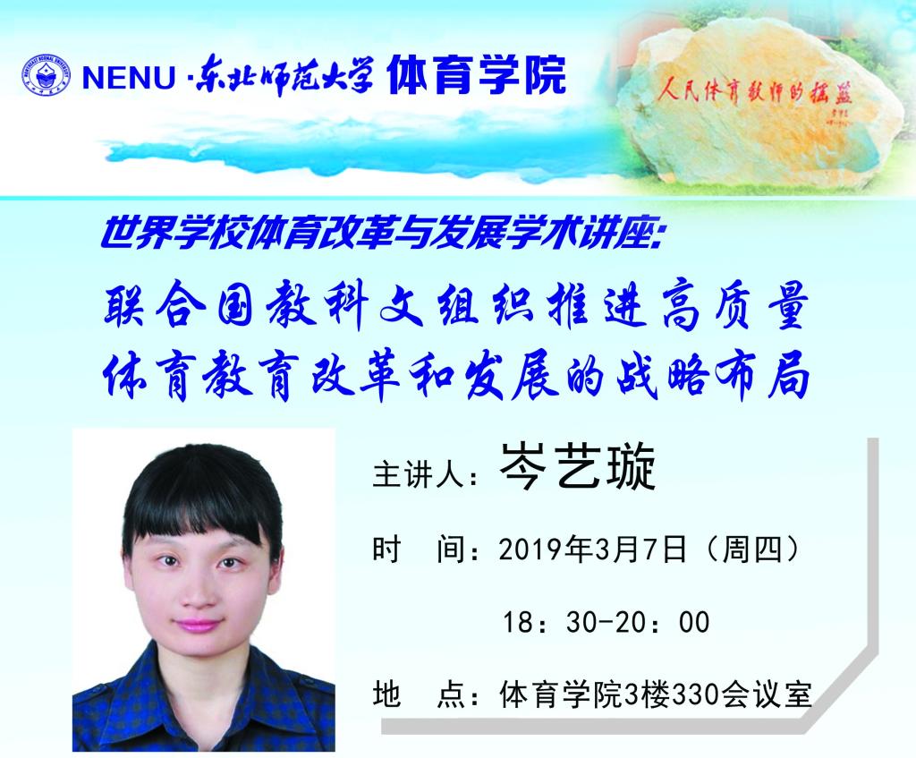 威尼斯官网岑艺璇老师将于2019.3.7(周四)晚18:30在学院3楼330会议室作题为《联合国教科文组织推进高质量体育教育改革和发展的战略布局》学术报告,欢迎各位老师莅临指导、研讨。